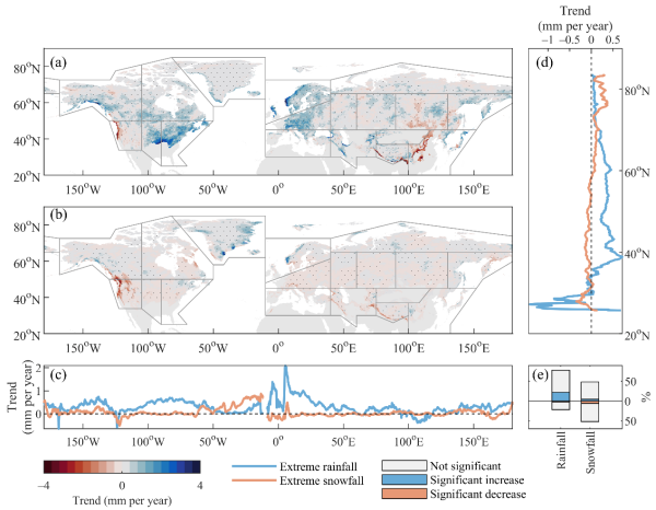 封面新闻10月20日从中国科学院获悉,中国科学院新疆生态与地理研究所研究员陈亚宁团队,利用ERA5-Land再分析数据(1950—2022),系统解析了北半球极端降雨和极端降雪的长期演变趋势、温度敏感性及驱动因子,相关成果发表在最新一期《Advances in Climate Change Research》上。研究显示,过去70余年间,北半球极端降雨事件以每年0.269毫米的速度显著增加,其加速率约为极端降雪(0.029mm/年)的9倍。温度响应上,两者呈现鲜明对比:极端降雨随气温上升显著增强,而极端降雪则受到抑制,尤其在30°–60°N中纬度地区表现突出。这表明全球变暖背景下,液态降水事件的敏感性远高于固态降水。