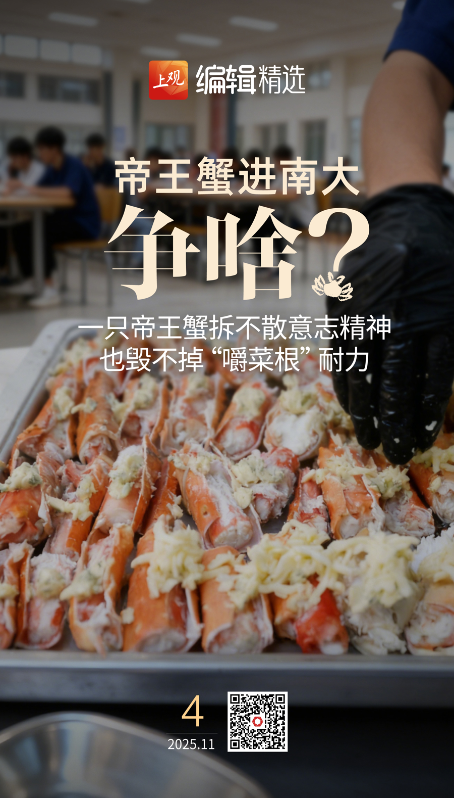 当然,能理解社会公众对高校学生的关注,毕竟今日之学子也会成为明日之社会栋梁,在这一过程中,公众也许存在着一种对学生“走偏”的忧虑。但很多时候,这种忧虑大可不必从小事中来,一只帝王蟹不至于摧毁学生的意志和精神,也不至于毁掉“能嚼菜根”的耐力,对美好事物的追求和体验,与我们素来推崇的勤勉精神之间,并非一道非此即彼的选择题。甚至有时候,对美好生活的追求和向往,恰恰是为之付出努力的动力。由此来看,一只帝王蟹而已,何必过度放大呢?