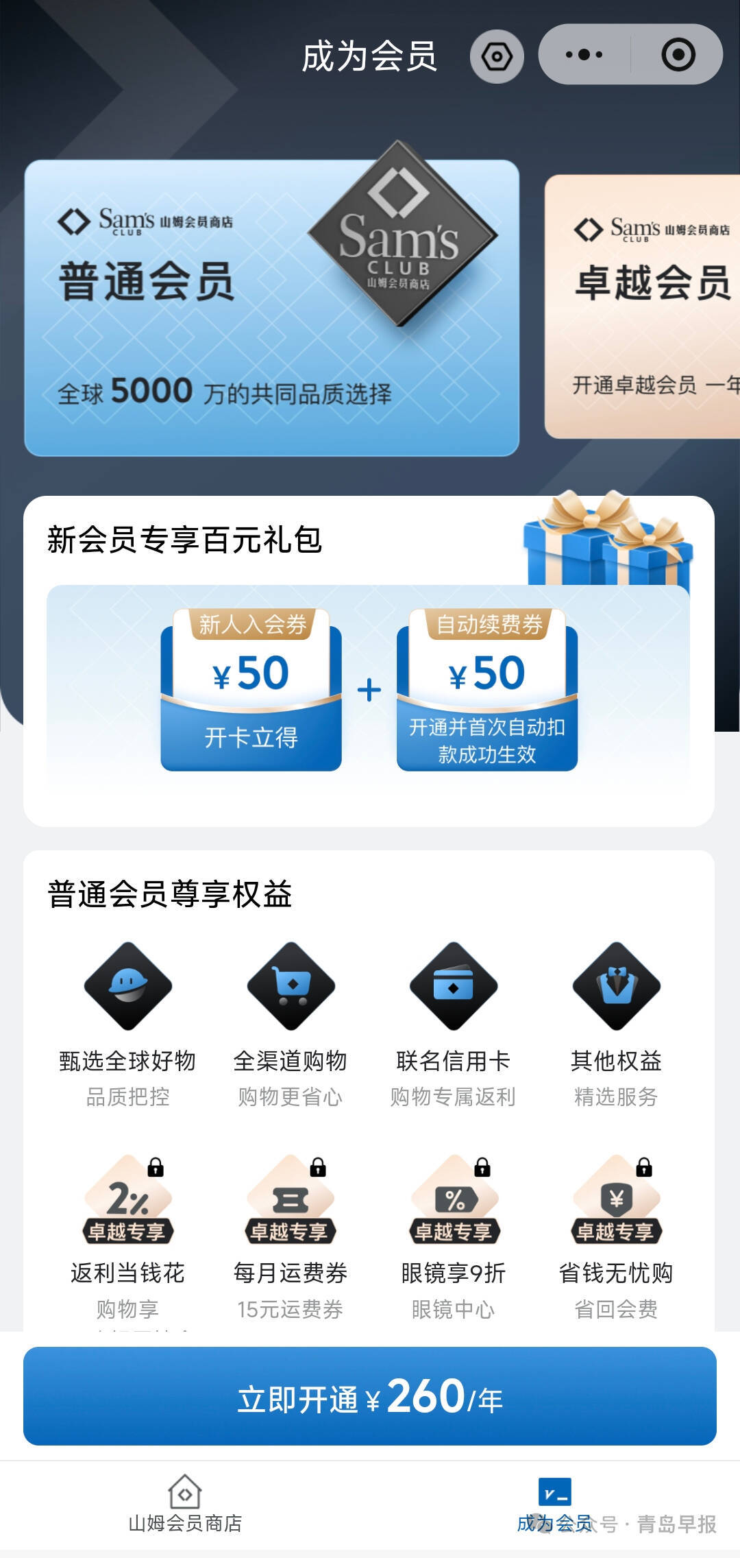 据了解,山姆会员卡线上线下(300959)均可办理,分为普通会员卡和卓越会员卡(均包含一张主卡和一张亲友卡)两种,普通会员费用为260元/年,卓越会员费用为680元/年。针对两种会员卡的差异,工作人员说:“卓越会员除享有普通会员全部权益外,还可享受每月消费返利,以及每月一张运费券的福利,性价比更高。”